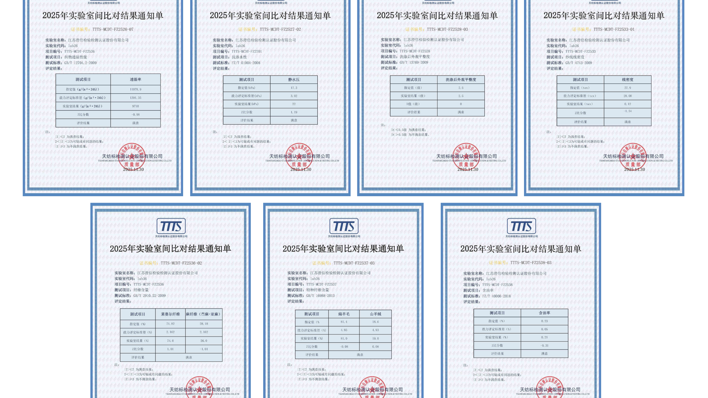 本次比对试验项目包括绒子含量、(绒丝+羽丝)含量、 浊度、蓬松度。结果评定基于绒子含量、(绒丝+羽丝)含量、浊度和蓬松度的数据分析及小样识别准确性、记录填写规范性共6个方面。在发布的结果中,纺织中心取得了100分的优异成绩,充分体现纺织中心在羽绒检测方面的精湛技术及雄厚实力。